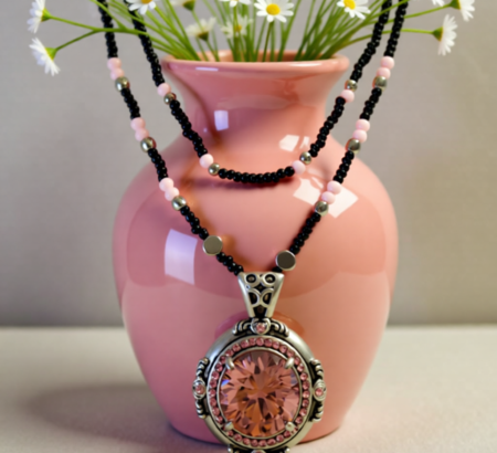 Pink Stone Pendant with Black and Pink Beads (Double Layered Necklace)